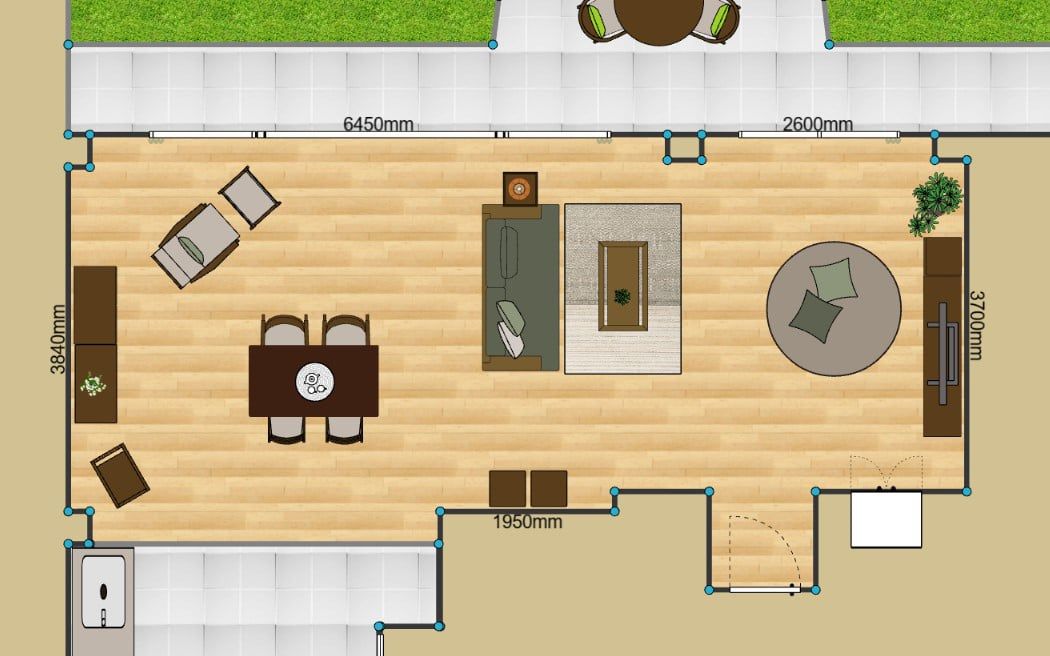 2LDKのリビングダイニング12畳のレイアウト例。2LDKの場合、間取りによってはLDKともう一部屋が隣合うことも。その場合、引き戸を閉めて使っても良いのですが狭く見えがちです。そのため、二部屋を繋げて使うことで閉塞感が無くなり、開放感のあるリビングとして暮らすことができるでしょう。