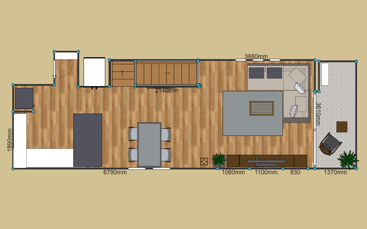 2LDKのリビングダイニング16畳のレイアウト例。家族4人でゆったり暮らせるL字ソファや幅の広いダイニングセットをレイアウトしています。階段を上がってリビングやバルコニー、ダイニングやキッチンなど、どのスペースにも快適に移動できる生活動線を設けました。