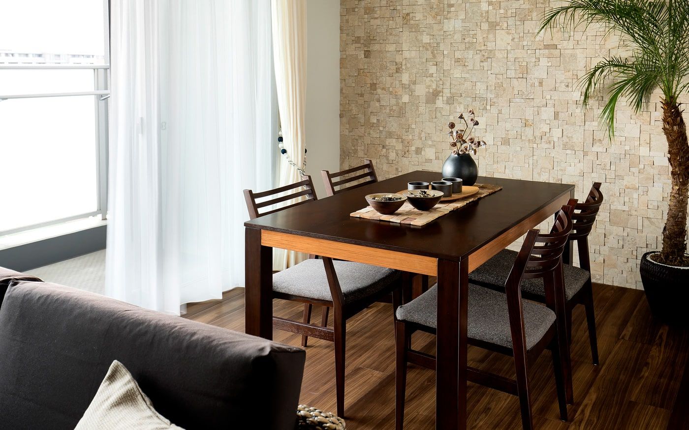 2LDKのリビングダイニング10畳のレイアウト例。都会の景観に合うシンプルなリゾートホテル空間を実現したいというお客様。天然素材の家具やグレー×ブラウンの配色を上手く取り入れて、大人のリゾート感を演出しました。一人暮らしのこだわりを詰め込んだ実例をぜひご覧ください。