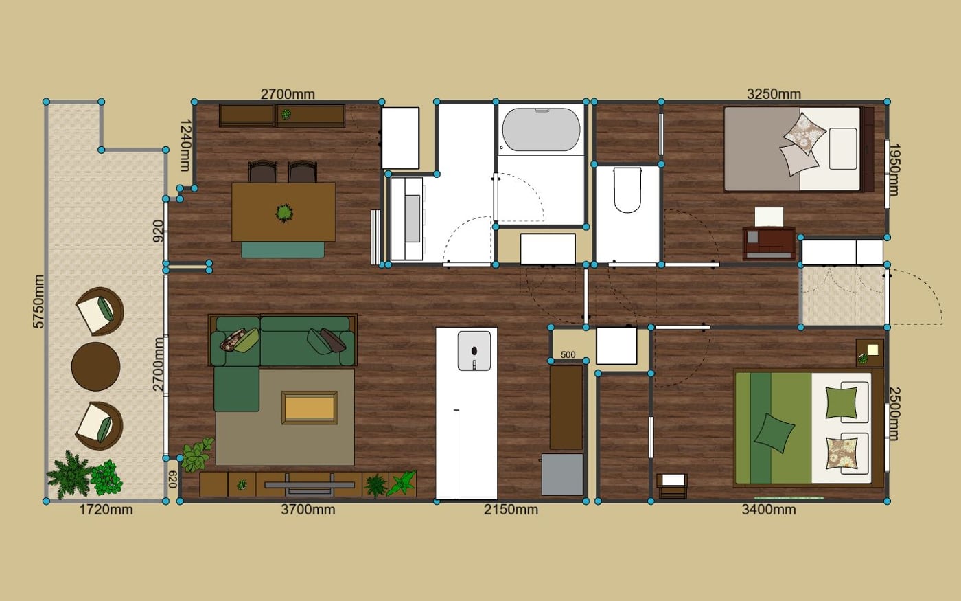 3LDKのリビングダイニング20畳のレイアウト例。20畳以上のLDKで別荘やセカンドハウスの場合、好みのテイストや旅行先で訪れたリゾートをテーマにすることも。この例ではハワイアンな部屋作りをしたい方におすすめのコーディネートで、爽快感に包まれるようなレイアウト・部屋作りが叶うでしょう。