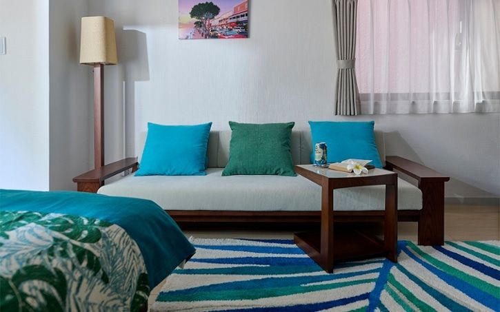 奥にベッド、手前にソファを配置した縦長の特性を活かしたレイアウト。ラグでリビング空間を明確にしつつ、ベッド横に余白を設けることで、ゆとりと落ち着きのある大人リゾート空間に仕上げています。