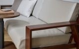 ベンチ型とコーナー型を組み合わせたベンチ型のソファ。コーナーの背もたれがやんわりと空間を区切り、ソファのくつろぎスペースをゾーニングしています。