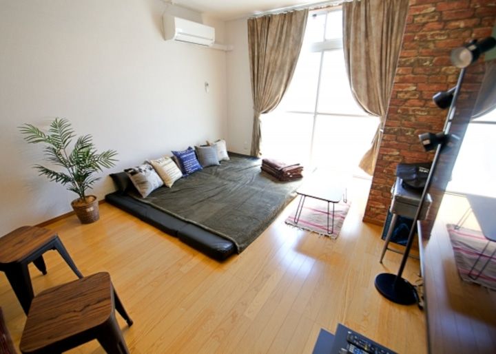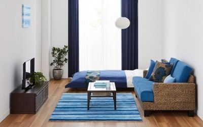 ワンルームをターコイズブルーを主役に広がりを感じるコーディネートに。床に近い暮らしでゆったりと過ごせる、自分だけのリラックスできる空間に仕上げました。