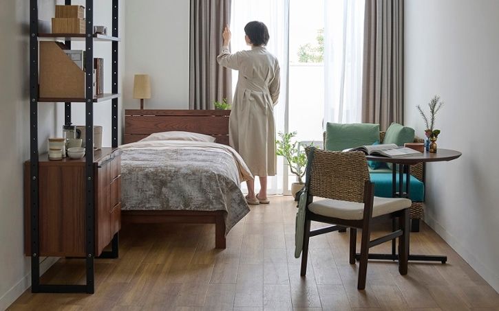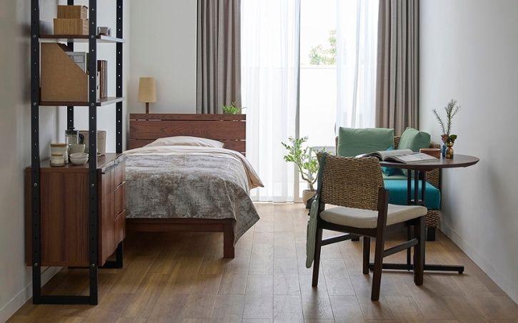 ローベッドを取り入れて視線を下げることで、窓への抜け感が生まれ、6畳でも開放的な印象に。限られた空間でも生活動線を確保しやすく、ゆったりと心地よい自分時間を過ごせます。