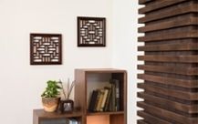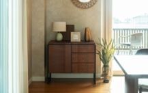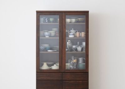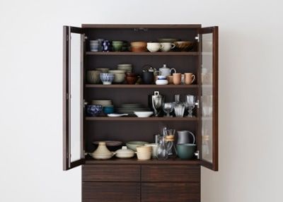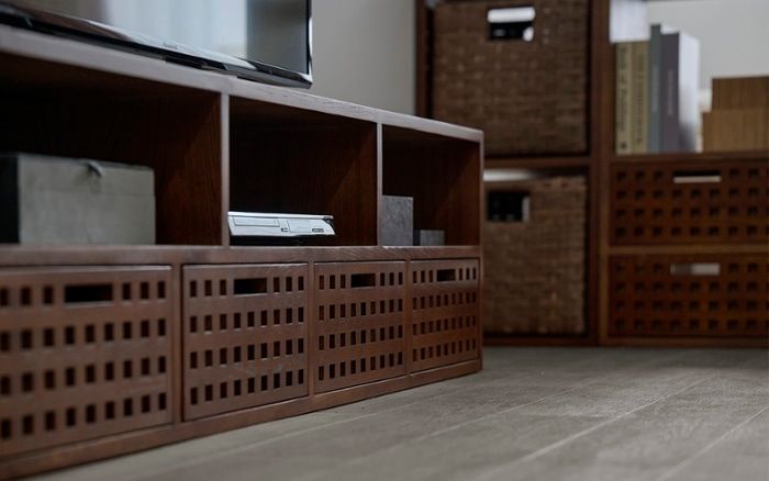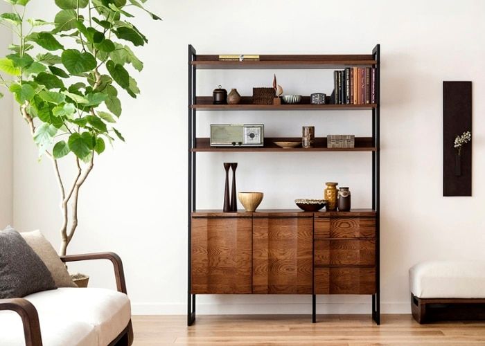 見せる収納と隠す収納を組み合わせ、ワンルームを効率よく活用するキャビネット。開放感と温もりを両立し、限られた空間でも心地よいレイアウトが完成します。