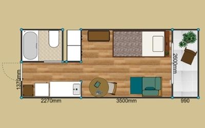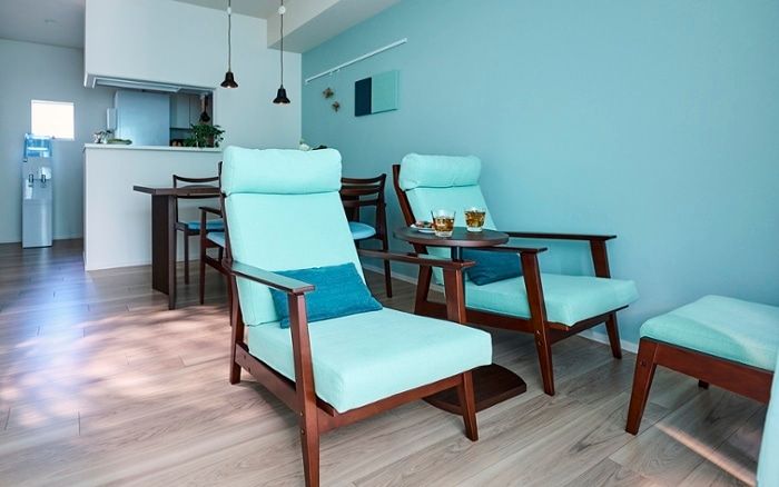 コーナーソファは、視線を遮りにくく、コンパクトな部屋でも広がりのあるくつろぎスペースを生み出します。ターコイズブルーをアクセントに取り入れることで、爽やかで洗練された印象を演出。
