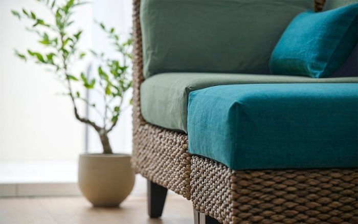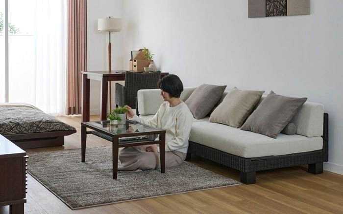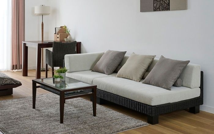 開放的なロー&ワイド設計と素材感で、ワンルームでも癒しのリゾート空間を演出。素材はヒヤシンス素材が2色、ラタン素材があり、お部屋の雰囲気に合わせて選ぶことができるのもポイントです。