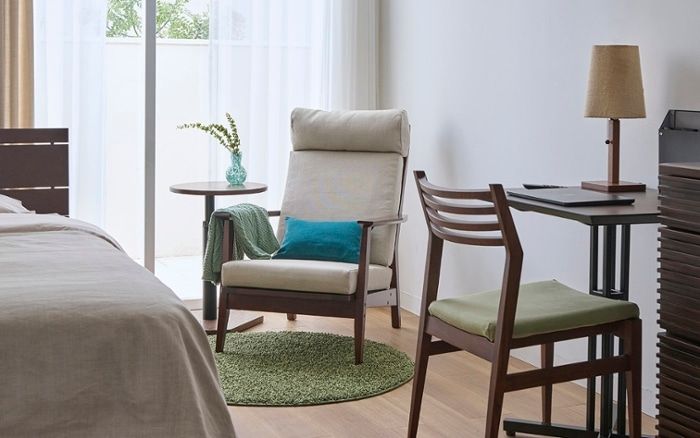 体を預けられるラウンジチェアは、自分だけのくつろぎを叶える空間の主役。窓際の配置で開放感を楽しみ、足元のグリーンラグで心地よい安らぎを。