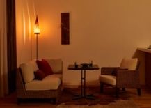 コンパクトに収まる円形テーブルに、ヒヤシンス素材のチェアを合わせたカフェ風レイアウト。天然素材のやさしい風合いが空間に温もりを添え、日常を少し特別な時間に変えてくれるでしょう。