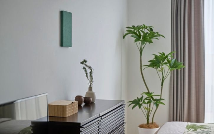 6畳の空間を、柔らかな日差しが似合うアースカラーでまとめたコーディネート。シンプルな構成ながら、ヒヤシンス素材やルーバーデザインをアクセントに取り入れることで、抜け感のある洗練されたおしゃれな空間を演出します。