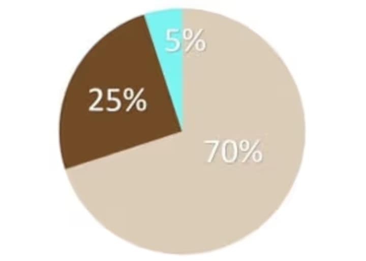 インテリアの配色は、70:25:5の黄金比率が基本とされています。最も面積の大きい色をベースカラー(基調色)、次に割合の大きい色をアソートカラー(従属色)と呼びます。まずこの2色を決め、最後にアクセントカラー(強調色)を加えてバランスの取れた統一感のある空間を作りましょう。
