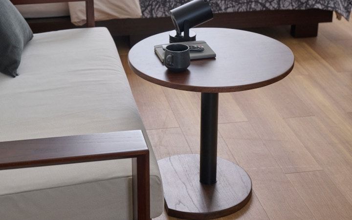 円形テーブルを使うことで、動線を確保しやすく、取り入れるだけでカフェのような心地よい雰囲気に。ベッドサイドでも活用できる汎用性の高い一台が、限られた空間を有効に活かしてくるでしょう。