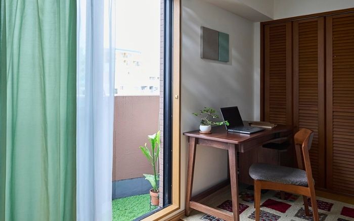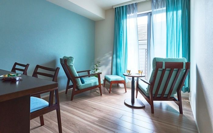 「星野リゾートのような空間を自宅で再現したい」「環境を変えて気持ち新たにスタートしたい」という思いから引っ越しを決めたお二人。こだわりが詰まったリゾートライクな部屋にはターコイズブルーのカーテンや家具を取り入れました。
