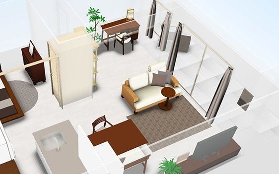 カーテンのカラーコーディネートはもちろん、全体の部屋作りでお悩みの方にぴったりなのが、a.flatの「3Dシミュレーションソフト」を使用したサービスです。お持ちの図面を元にシミュレーションを作成し、2Dや3Dで確認することが可能です。
