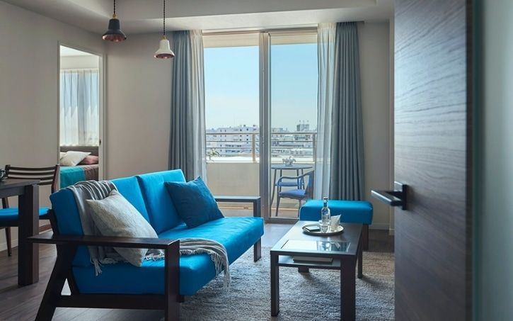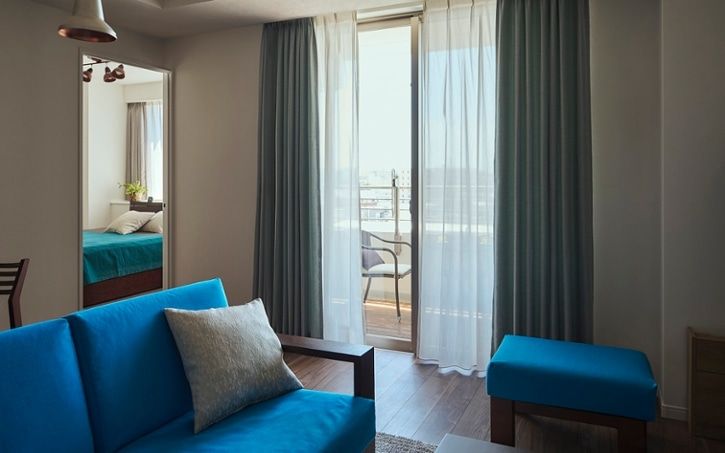 窓の外に抜けるようなアクアブルーのカーテンで、開放的な空間をさらに広々と感じられます。ハイバックソファとクッションの存在感が良いアクセントに。
