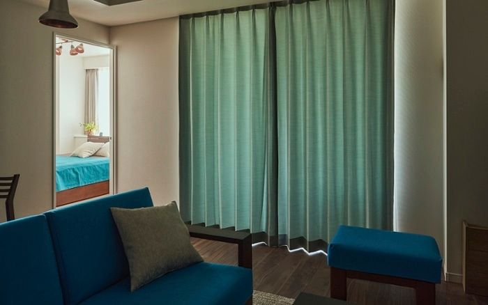 快適な二人暮らしにぴったりな2LDKのインテリア実例。ブルーとグレーの要素を持ち合わせたドレープカーテンは、寝室から覗く深みのあるグリーンとも心地良く調和します。