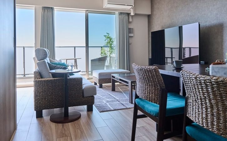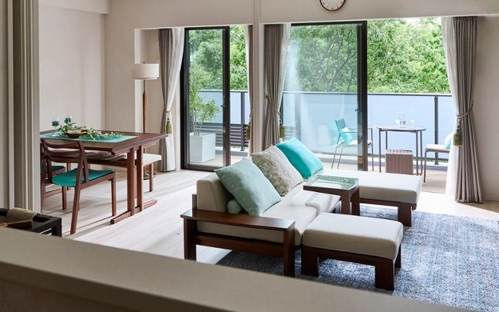 星野リゾートのような洗練された空間を自宅で再現するためには、家具の配置にもこだわりたいものです。特にラウンジチェアは、リゾートのラウンジを彷彿とさせるよう、外向きに配置することで毎日の二人暮らしに開放感を演出します。