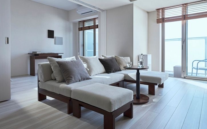 カウチタイプのローソファがリゾートホテルを思わせるリビング