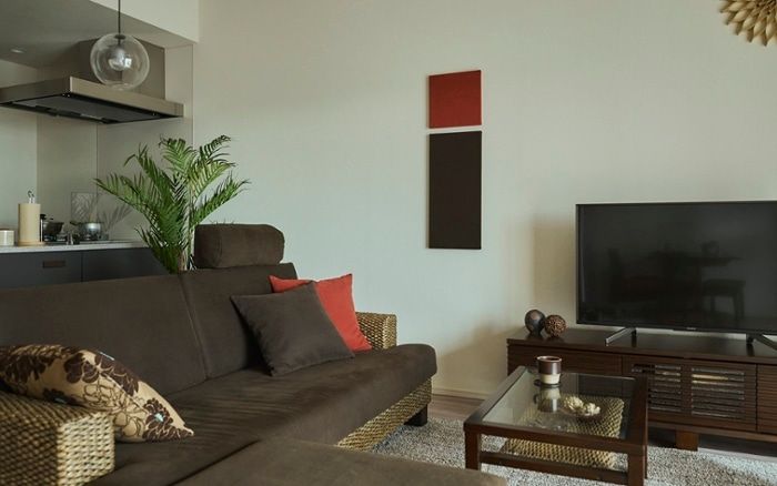 ベーシックなブラウンをベースにコーラルを程よく取り入れた沖縄リゾートのような空間を実現した実例。ローソファやローダイニングテーブルを中心に、空間を広々と見せる家具で揃え開放感があります。