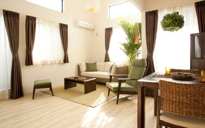 東南アジアや、バリのウブドを連想する森リゾートのような雰囲気をイメージしたリビング。都会の高層マンションでは緑が目に入る光景が少ないため、ファブリックで癒しの空間作りを叶えたコーディネートです。