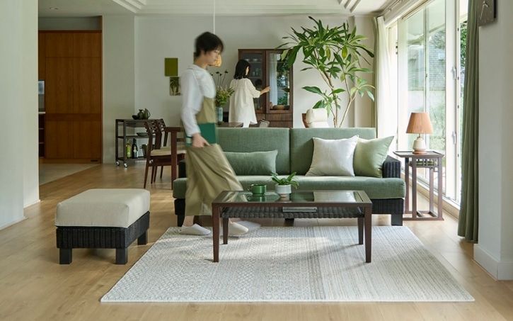 落ち着いたグリーンのカラーコーディネートで包まれたリビングに、ゆったり昼寝ができるソファを配置。アームがセットバックしていて足が伸ばしやすいため、ストレスなく長い時間でも昼寝できます。