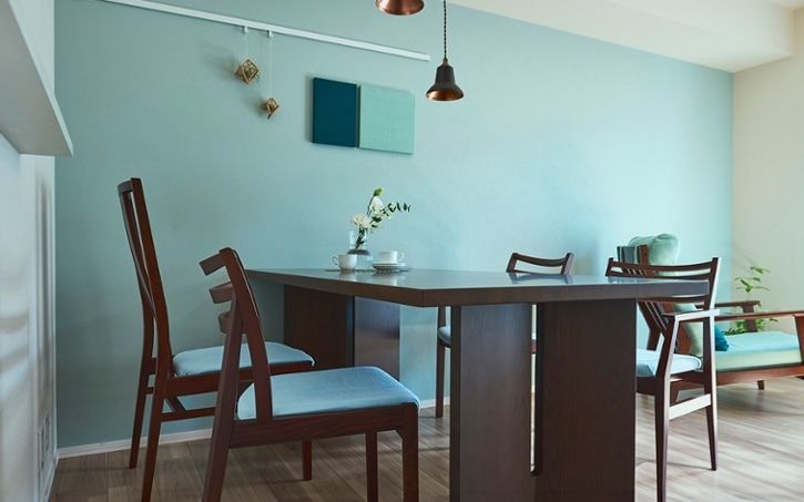 落ち着いた雰囲気と明るさを兼ね備えたブラウンの床は、比較的どのような家具・インテリアでも置きやすい床の色とされています。今回は、このブラウンの床にダークブラウンの素材感溢れる家具を置き、爽やかなブルーのインテリアを使って、高級感や落ち着きのある空間に爽やかさを演出したお客様コーディネート実例をご紹介致します。