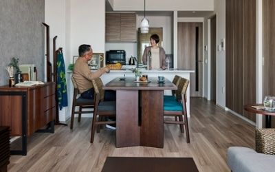 自然素材を活かしたダイニングセットや収納家具を取り入れた心地よい空間を実現。