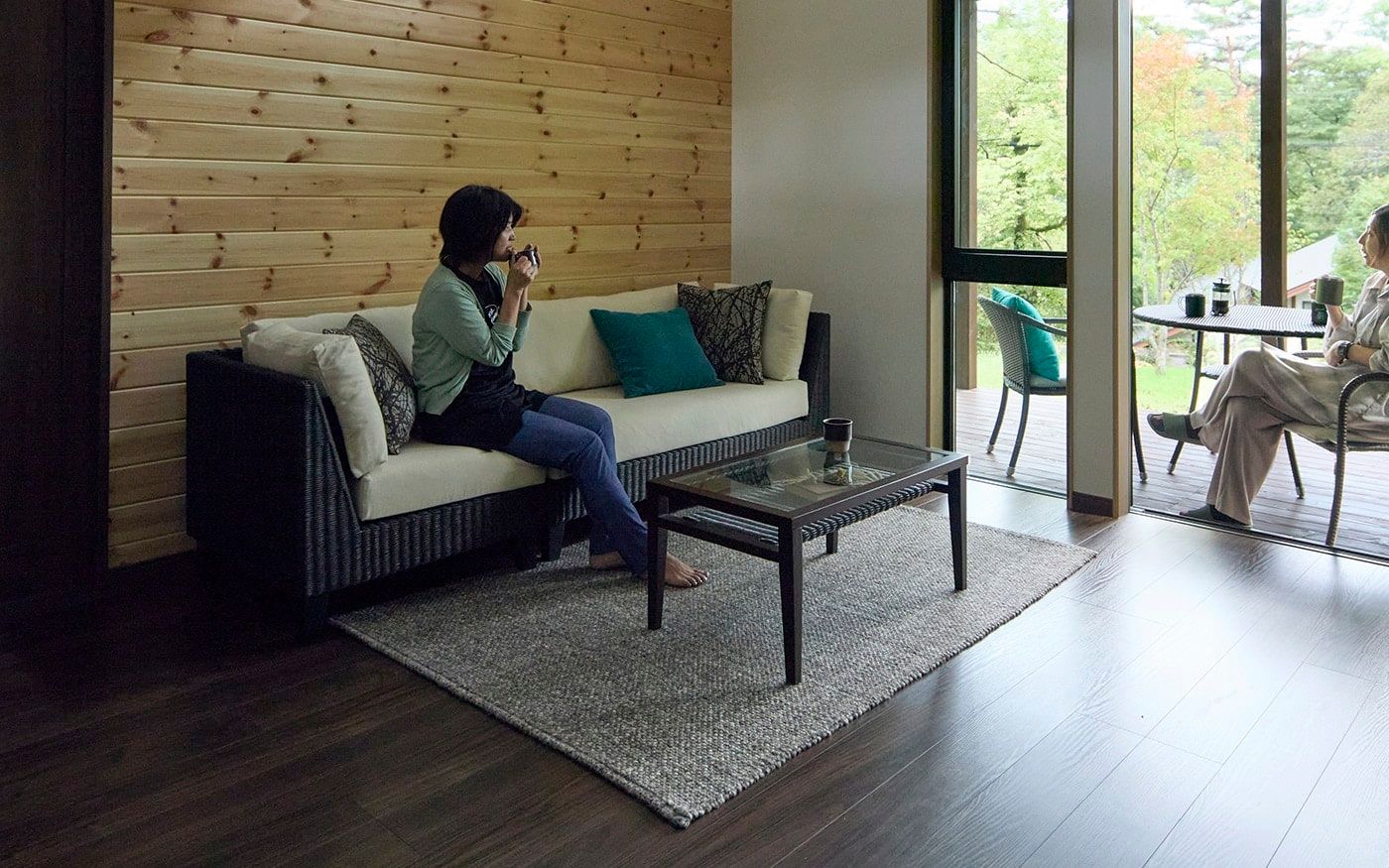 室内のソファとテラスに設置した屋外用家具を合わせて、別荘らしい贅沢な暮らしが楽しめます。借景を邪魔しない自然素材ラタンを使った家具や、ダークブラウンの家具がポイントです。