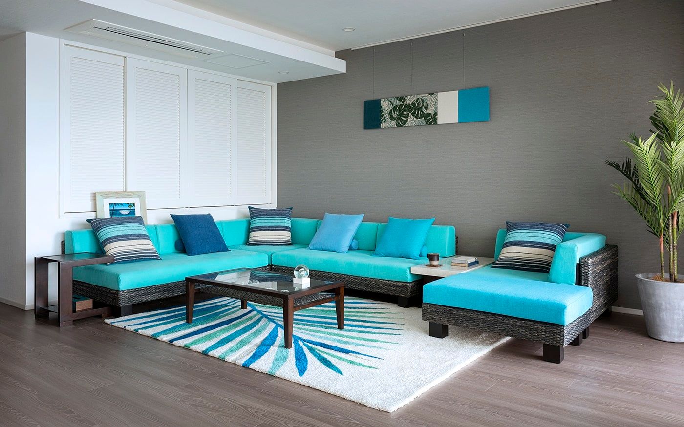 また単色使いではなく、淡いブルーのソファカバーに濃いターコイズブルーのクッションやラグを重ねてグラデーションすることで、コントラストがはっきりし、広いリビングに立体感を与えてくれます。