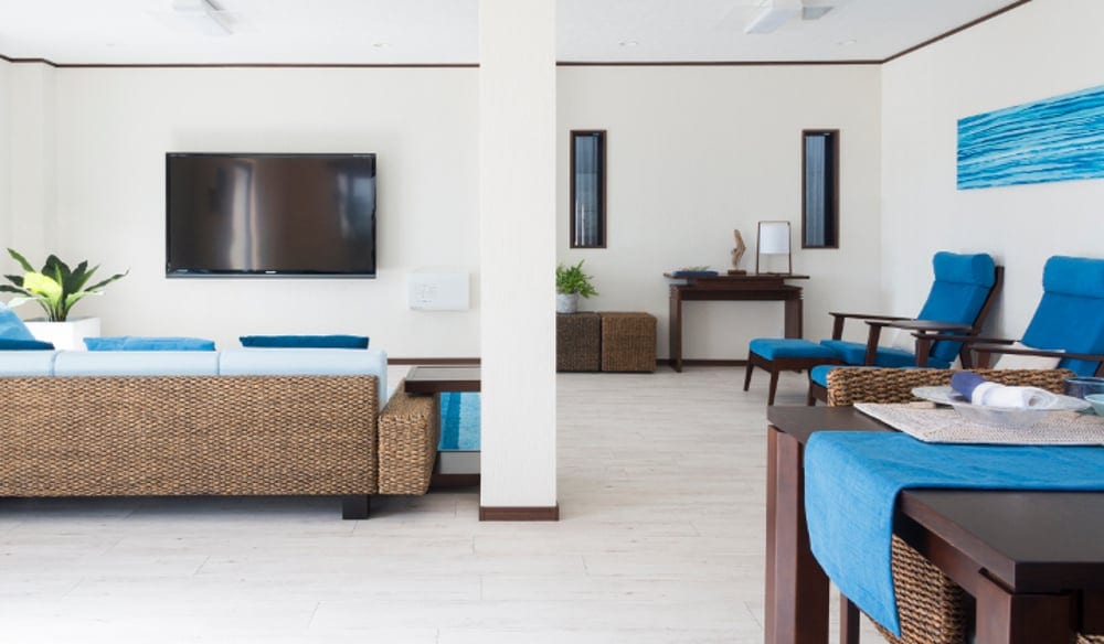 雄大な海を思わせるリビングには、広々としたコーナーソファがあり、南国ムード溢れるヒヤシンスが大人の雰囲気を演出します。