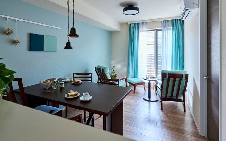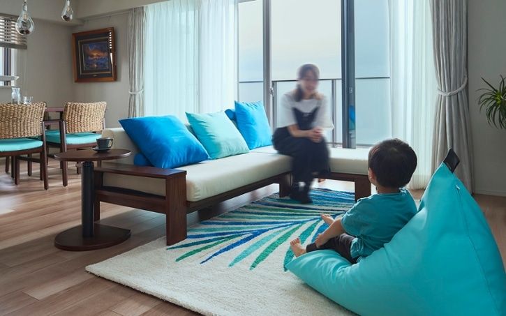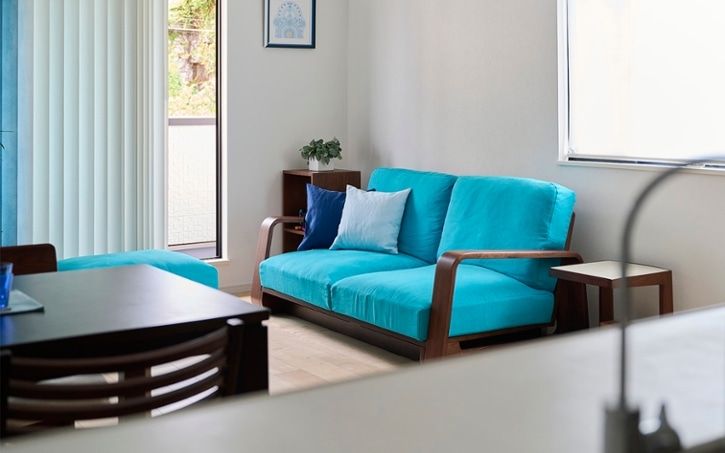 ブルーのソファカバーは、海や空を連想させる清涼感と開放感のあるリビングを演出します。視覚的に鎮静効果のあるカラーでもあり、空間に落ち着きをもたらし、寛ぎやすいリビングが叶いますね。