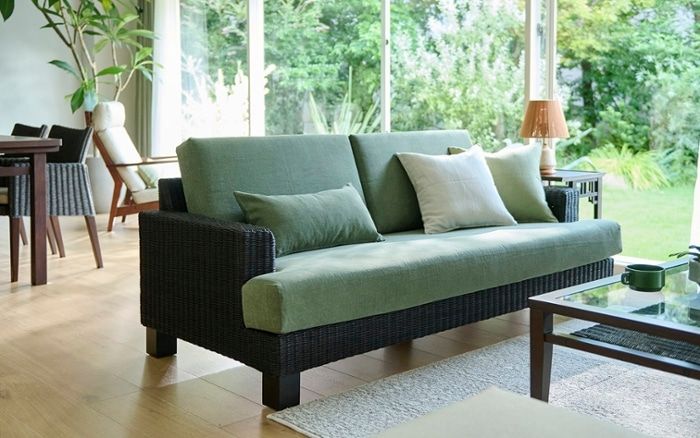籐素材を編み込んだデザインのスタンダードソファ。落ち着きのあるデザインで、大人っぽいリビング空間が叶います。