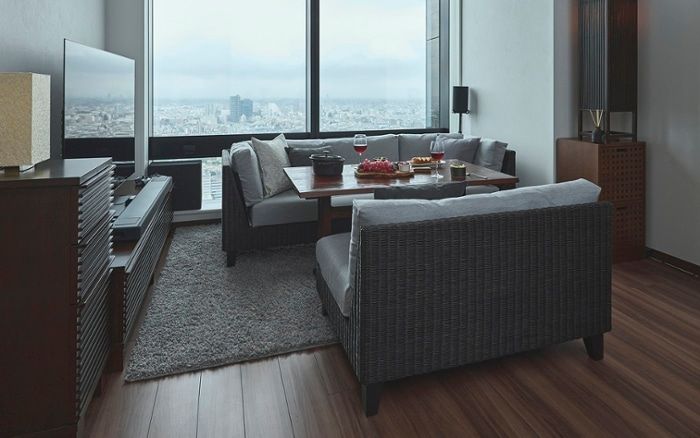 こちらは20畳の広いリビングを使い、ソファを贅沢に複数置きしたレイアウト実例。大人数で団らんを楽しめるリビングを作りました。ホテルライクなレイアウトで、より寛ぎ感のあるコーディネートを叶えています。