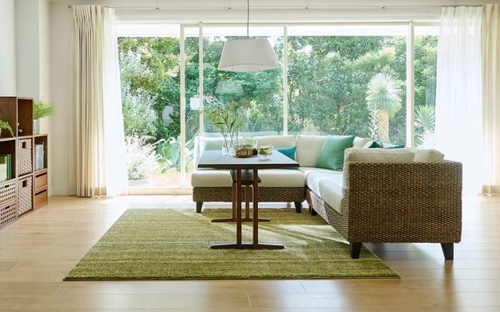 癒しやリラックス効果のあるグリーンを中心にした、リビングのコーディネート実例。穏やかな自然で寛いでいるような、思わず長居してしまう空間を演出します。無垢材家具と相性が良く、居心地の良いコーディネートを作れます。