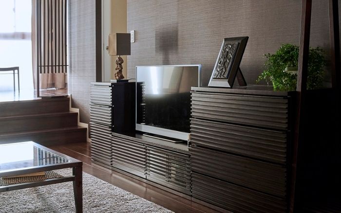 ダークブラウンのキャビネットに合わせて、リビングのインテリアカラーをブラウンで統一されたおしゃれな空間です。ヒヤシンス素材のローソファとブラウンカラーの相性も抜群。ホテルライクな高級感のあるリビングとなっています。