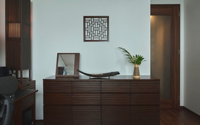 やさしいアジアンリゾートの海風がもたらす、打ち寄せる波から着想を得たデザインが魅力のルーバー・キャビネット。シンプルな水平ラインが洗練さや素材の温もりを感じさせます。
