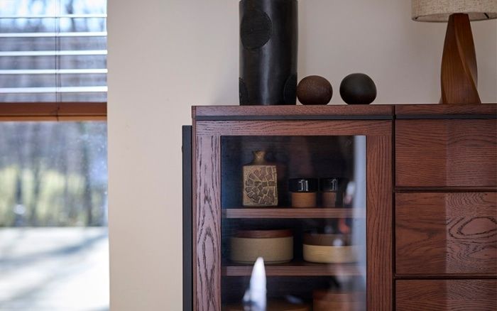キャビネットなどの収納家具は、扉や引き出しが付いているタイプが多くあり、扉部分のデザインでキャビネットの印象が変わります。また、脚の有無によっても印象や使い勝手が変わってくるので、キャビネットのデザインを検討する際は、扉や脚に注目してみましょう。