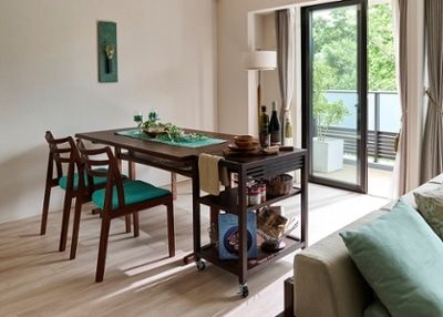 こちらの部屋では、ダイニング周りの収納を充実させています。キャビネット以外にも2WAYの収納箇所を用意しています。忙しい時もサッと片付けができます。