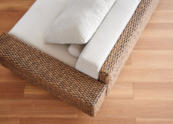 天然素材であるラタンやヒヤシンス素材でつくられているケイ・ローソファ・シリーズですが、その背高は約58cmしかなく座面高も約33cmとかなり床面に近いソファとなります。もともとローソファは重心が低く目線が下がることによりお部屋全体を広く開放的に見せる効果がありますが、ケイ・ローソファは拡張性にも強みを持ち、ライフスタイルの変化により買い足してコーナーソファにしたり、カウチソファセットにしたりと変幻自在に楽しむことができます。