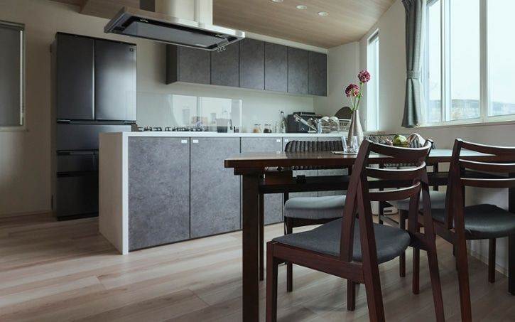 シンプルで洗練感のある無垢材を使ったテーブルを配置。シックで落ち着いたグレーの床に、温もりあるテーブルが好相性です。