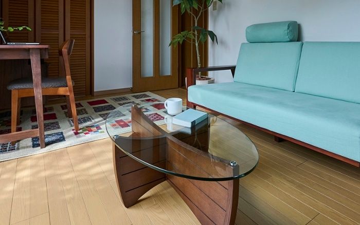 抜け感のある木製ソファを選び、空間に軽やかさを演出。また、ラグを敷かずに床を見せることで、部屋全体が広く感じられます。さらに、ガラスのローテーブルを取り入れて、視覚的な抜け感を作って部屋をより開放的に見せました。
