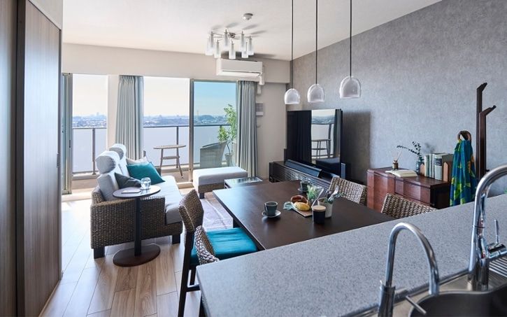 「LDK・隣の部屋・ベランダ」の3つスペースを、一つの大きな空間としてレイアウトしたコーディネート例。繋がりのあるコーディネートによって、自宅にいながらリゾートのような心地良さを感じる贅沢空間です。