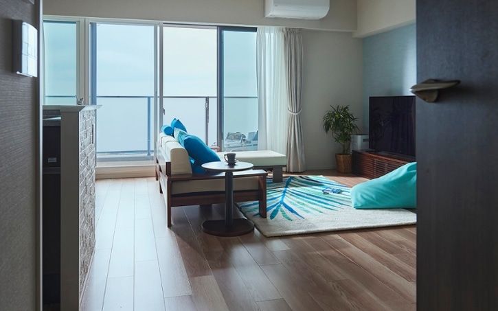ターコイズブルーのソファが主役の空間は、まるで海と空に包まれているかのような爽やかさを感じさせてくれます。自然光が差し込むと、さらにその美しさが際立ち、まるでビーチリゾートにいるかのような開放感を再現されました。