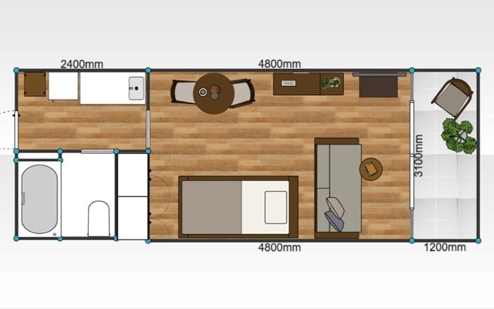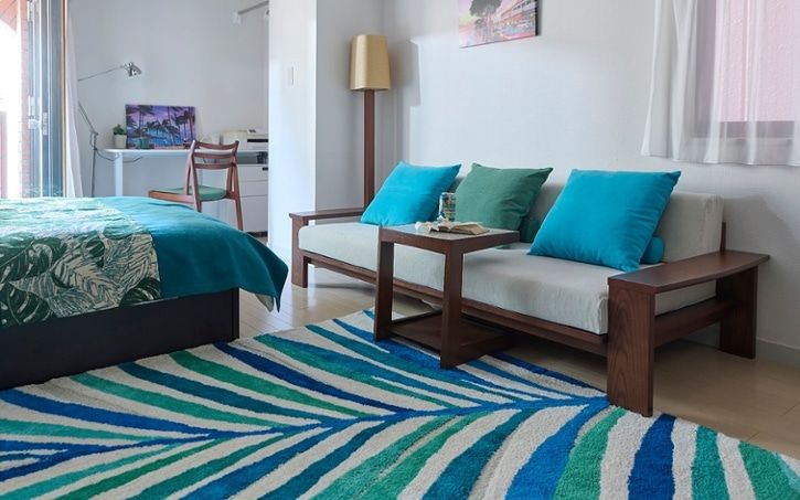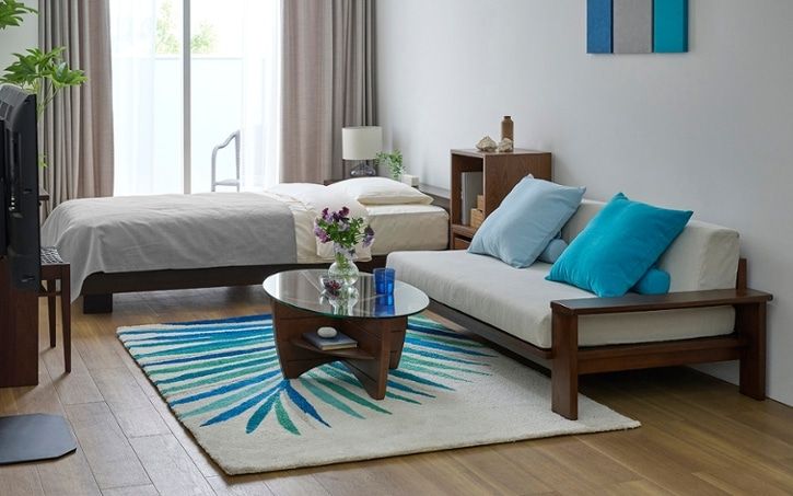 12畳の広さを活かし、収納家具をパーテーションにしてリビングと寝室をセパレート。2部屋感覚のゾーニングで生活にメリハリが生まれます。ターコイズブルーをアクセントに添えれば、自分らしい海を感じる快適な一人暮らしが完成。
