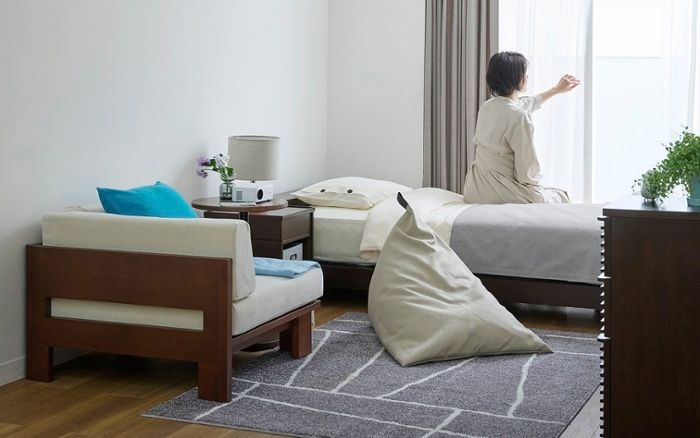 最大のメリットは部屋を広く見せる・使えるという点。しかし長時間の床座りは足腰に負担がかかったり、来客時に困るというデメリットも。そのため座椅子やビーズクッションなど、ソファ変わりのアイテムを取り入れることをおすすめします。