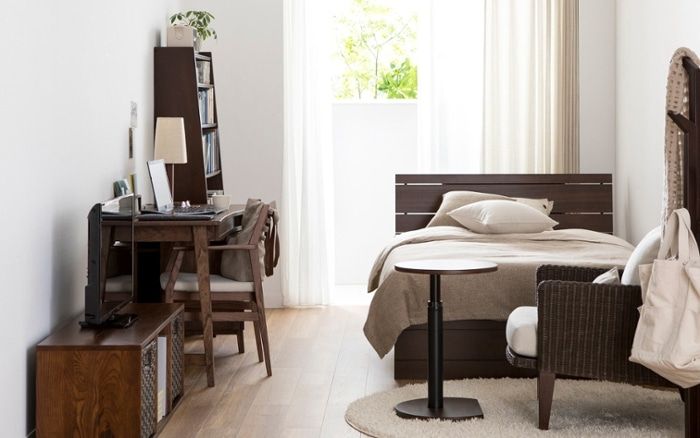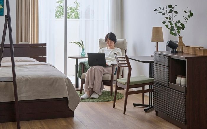 曲線デザインが美しいデスクと、背もたれに抜け感のあるチェアを合わせることで、軽やかな印象に。ベッドも無垢材で統一すれば、仕事と休息が心地よく調和します。ワンルームでも集中力がより一層高まるワークスペースが叶うでしょう。