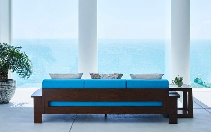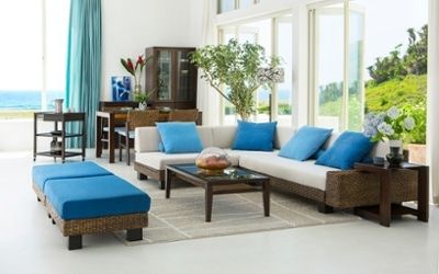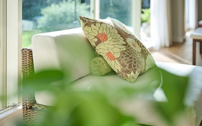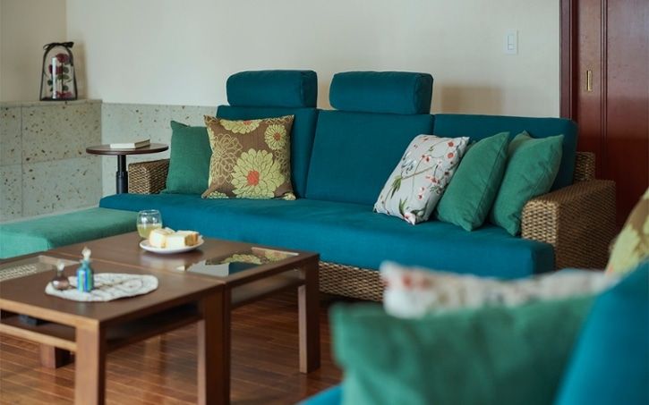 ヒヤシンスソファを主役に、アジアンリゾートらしい深いグリーンのソファカバーや花柄のクッションを合わせたコーディネート。異国感のある組み合わせはオリエンタルな空気を生み出し、暮らしに深いリラックス感を与えてくれます。また、広い空間を活用したソファのレイアウトも大胆で、海外インテリアらしさがありますね。