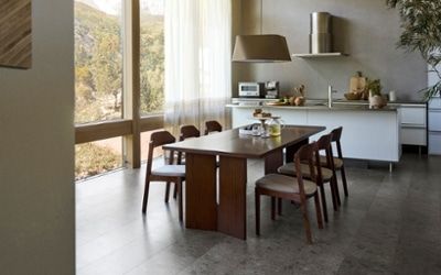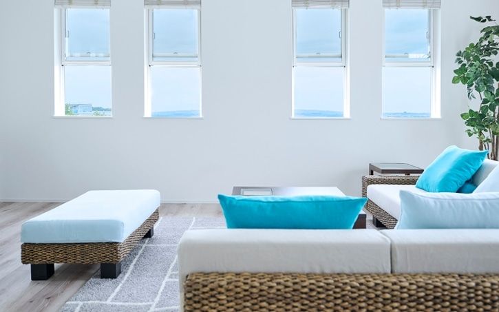 真っ白な内装とガラス張りの開放感溢れる空間を、存在感のある無垢材の家具とターコイズブルー×ホワイトの配色で、煌めくエーゲ海の風景を再現したコーディネート。また、日本の住宅の床材はフローリングであることが多いですが、タイル調にするだけで海外インテリアならではの非日常感を手に入れることができます。