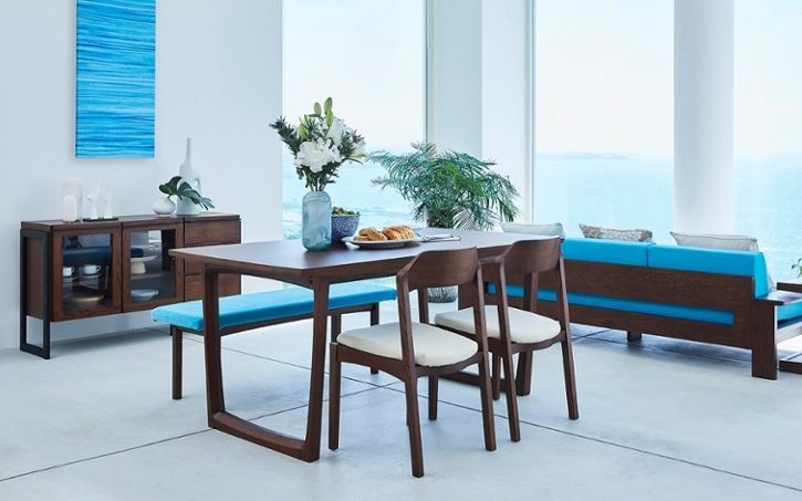 目を瞑ると小鳥のさえずりや木々を抜ける風の音が聞こえる、そんな心地の良いプライベートヴィラを再現したインテリアコーディネート。淡いグリーンのヒヤシンスソファや無垢材のテレビボードからはチェンマイの雄大で力強い自然を感じられます。ヴィラで過ごすリラックスタイムを楽しめるリビングダイニングルームです。