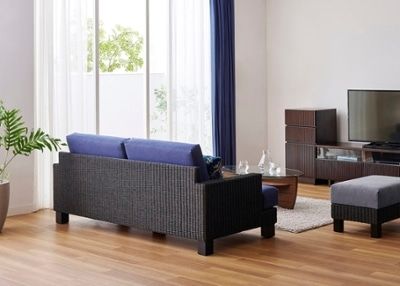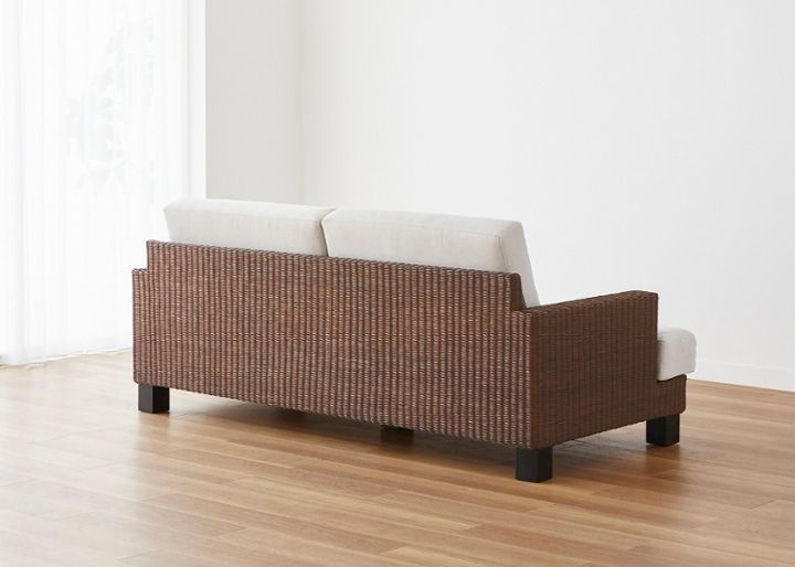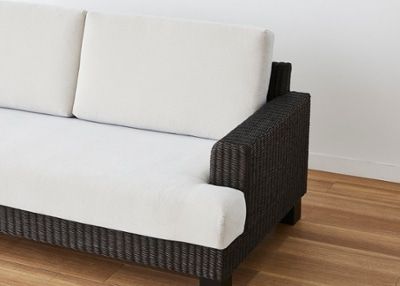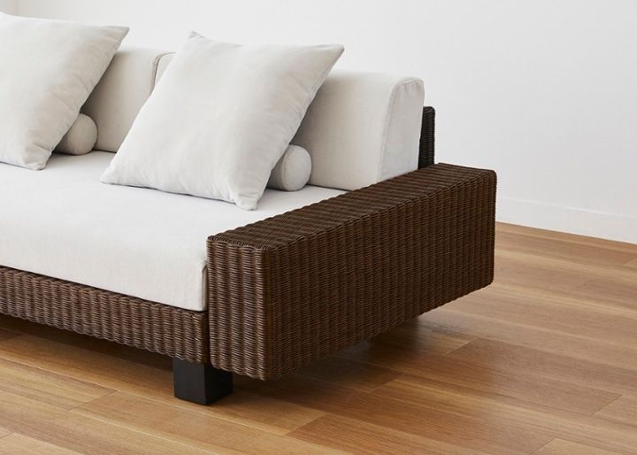 自然の風合いを活かしたマットな質感と繊細な編み込みデザインで、爽やかなリゾートの風を演出するラタン素材のソファ。深みのあるダークブラウンの色合いが相まって、安らぎに満ちた癒しのリビングを叶えます。